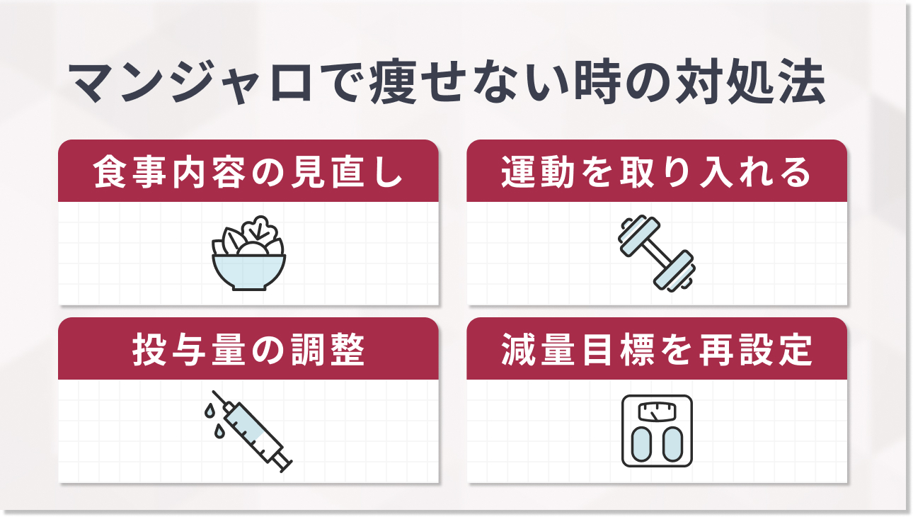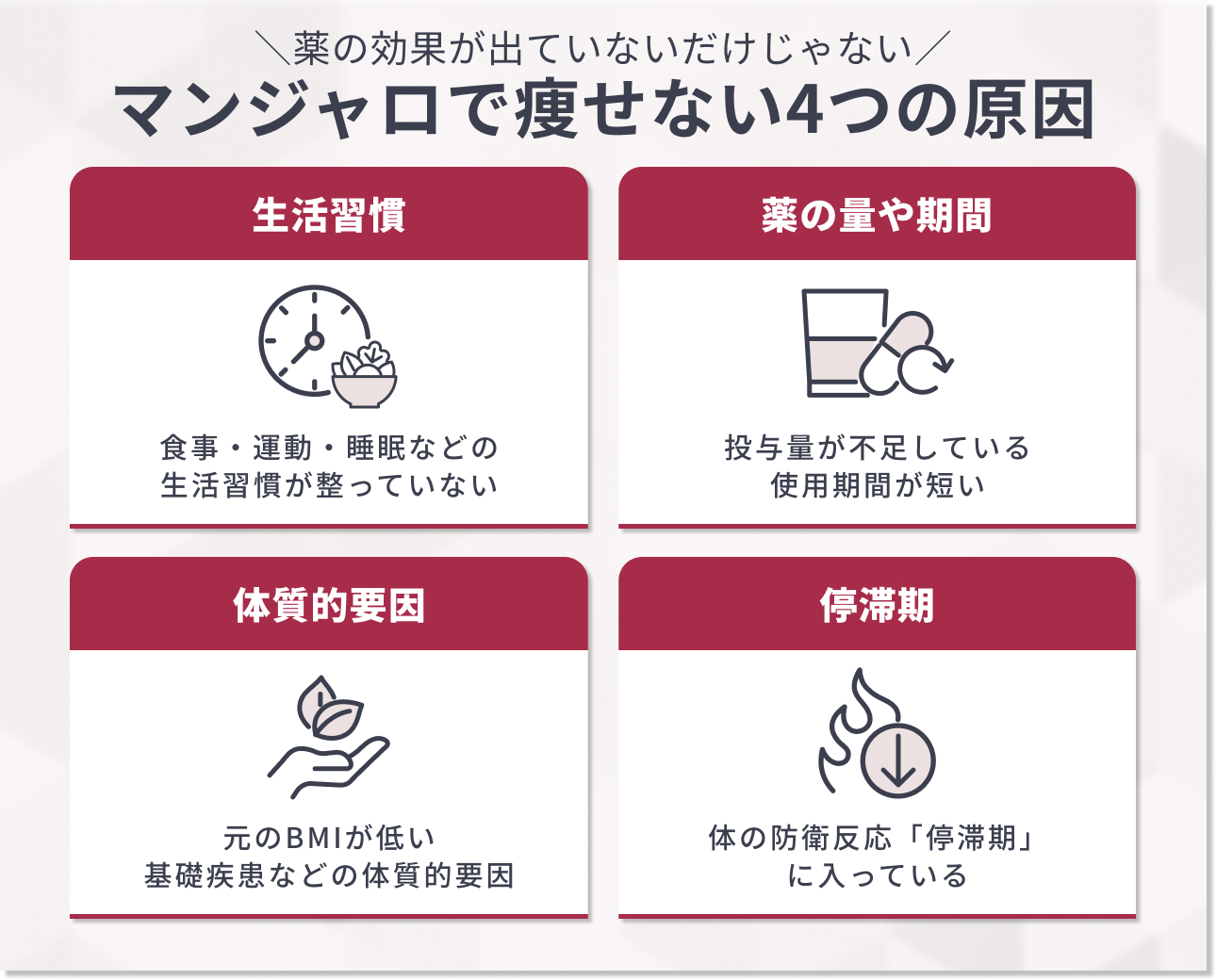 マンジャロを使えば誰でも自動的に痩せるわけではないため、原因を特定し、適切な対策をすることが大切です。