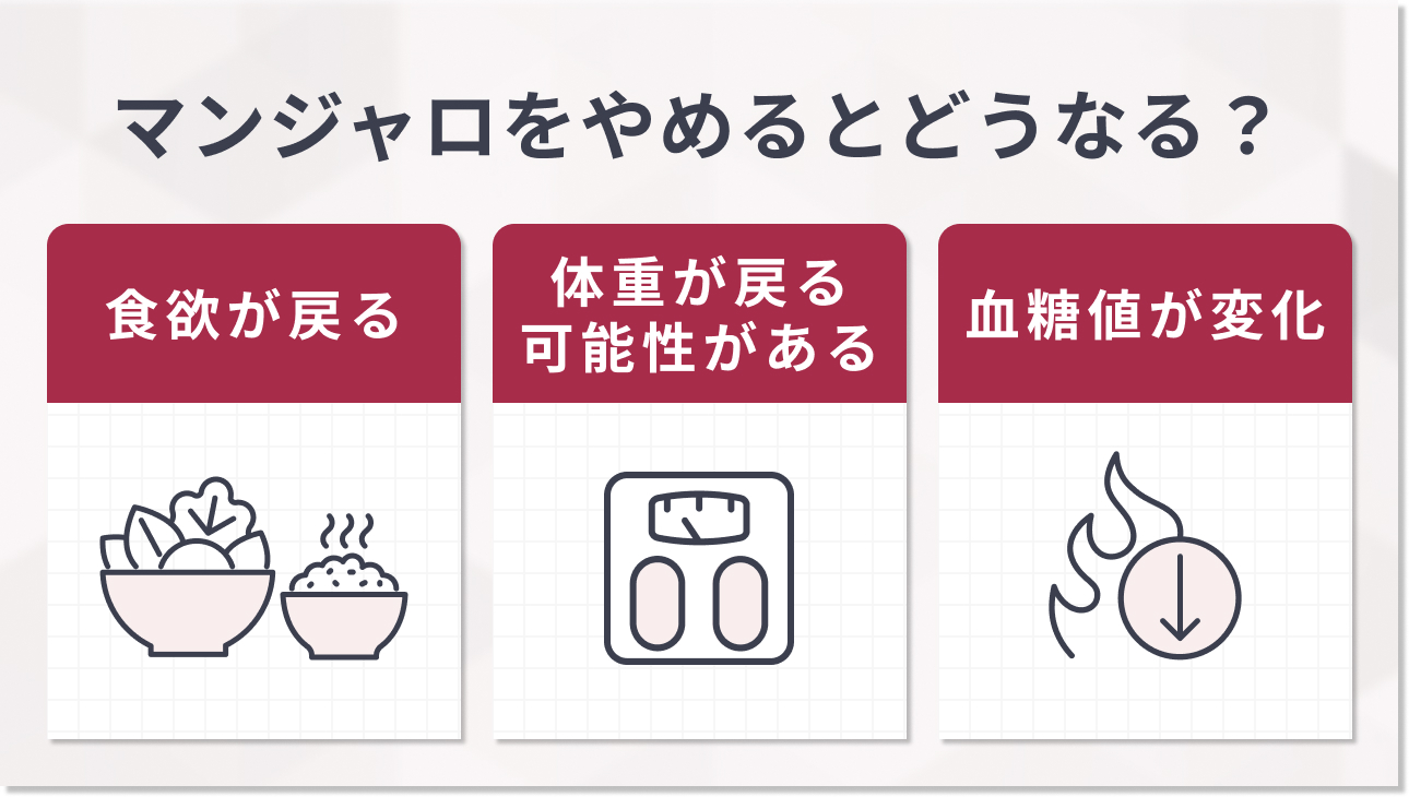 順調に体重が減ったとしても、マンジャロの使用を中断した後にどうなるのか不安に感じる方は多いでしょう。